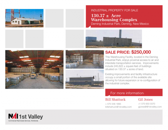 A Warehousing and Distribution Facitity Site in Deming, New Mexico is being offered for sale. Improvements include: 118,000 SF of pre-engineered...