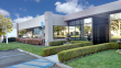 A two-story building with elevators and a courtyard.