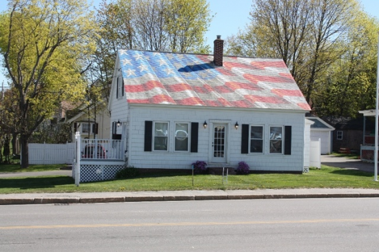 Office building with a unique portrait design on the roof of the American Flag, built of colored shingles, modern offices, conference room, kitchenette...