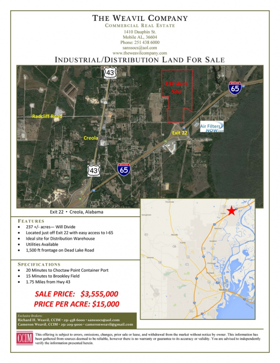 237 +/- acres. Will divide. Located just off Exit 22 with easy access to I-65. Ideal site for Distribution Warehouse. Utilities available. 1,500 ft. frontage on Dead Lake Road. 20 minutes to Choctaw Point Container Port. 15 minutes to Brookley Field. 1.75 miles from Hwy. 43.