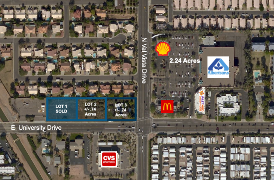 Two lots of approximately .74 acres each (approximately 1.48 acres total) of undeveloped land located on the NWC of University Drive and Val Vista Drive. This site is one of the few undeveloped corners in Mesa and offers high traffic counts with frontage along both University Drive and Val Vista Drive. Centrally located in Mesa, the parcel has easy access to both Loop 202 and the US 60 and surrounded by high demographic residential areas. The property is close to retail and business amenities and is minutes from Falcon Field Airport. This site has potential for multiple buildings of up to 10,000 SF each with plentiful parking available. Great East Valley opportunity for Owner/User or Investor. This space offers accomodations for: office.