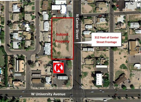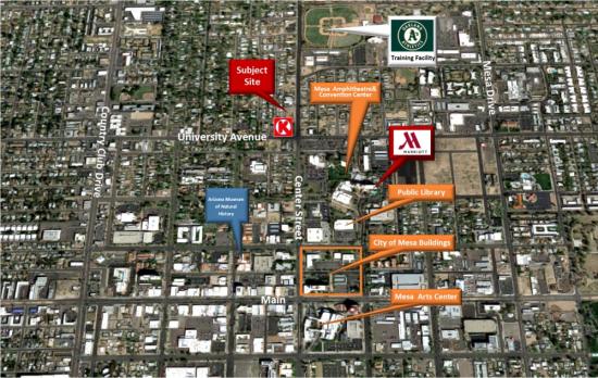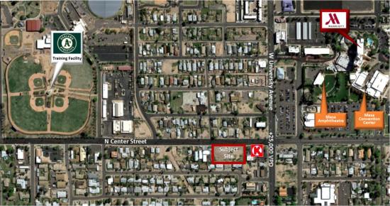 Great location in central Mesa close to Mesa Amphitheater, Mesa Convention Center and the historical area. Only a few blocks north of vibrant downtown Mesa's main street featuring trendy shops and restaurants, Mesa Arts Center and light rail access. One block from Oakland A's training facility Fitch Park. High traffic counts of exceeding 25,000 VPD at intersection of University Ave and N Center St.