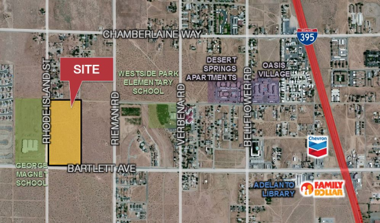Take I-15 N and exit Highway 395 towards Adelanto. Make left onto Bartlett Ave. Property is on the right, at the corner of Bartlett Ave and Rieman Rd.