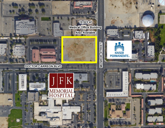 2.41 acres commercial land at a prime signalized corner across from JFK Memorial Hospital & Kaiser Permanente. Adjacent 10,523 sf multi-tenant medical office building to the north available as well.