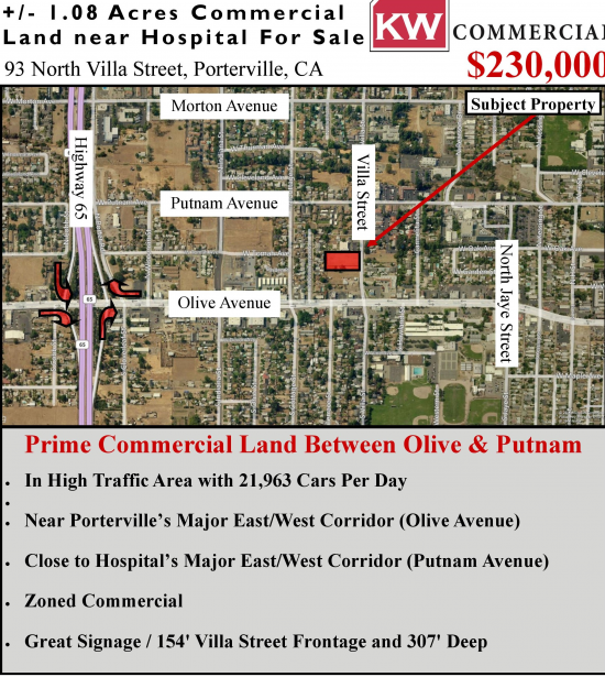 Prime Commercial Land Between Olive & Putnam In High Traffic Area with 21,963 Cars Per Day Near Porterville' s Major East/West Corridor (Olive Avenue). Great location near Putnam Avenue in the Professional Office district which leads directly to the Hospital and Downtown Porterville. Highway 65 Off/On Ramps at Olive Avenue is within close proximity as well. The Site is suitable for retail, professional and medical offices, apartments, or a shopping center. Property has Great Signage opportunities with 154' Villa Street Frontage and 307' Deep. Fully improved, shovel ready and complete with all sidewalks, & Utilities curbs, gutters and all utilities. Lot has (1) Curb Cut. Property has well built walls on each side and the back separating property lines. This space offers accomodations for: office.