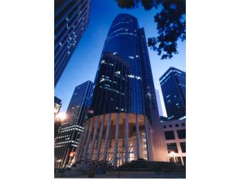 The building includes a cylindrical office tower with alternating bands of granite and glass that create patterns of light and shadow, 7-story glass-enclosed lobby, building surrounded by a public plaza, full height solid core teak interior doors, dual pane tinted glass windows, fiber-optic and cable wired, 8'10" high ceilings, 2'x4' fluorescent lighting with parabolic reflective louvers and incorporated air conditioning vents, 2 elevators connect the lobby to the lower level parking structure, and HVAC 8 am to 6 pm Monday thru Friday, and 9 am to 1 pm Saturday. Each floor has 2 separate air volume systems with independently controlled handling units for air distribution. There is a 24-hour building engineer.