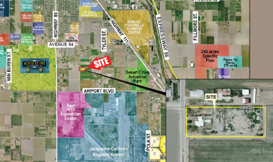 3.35 ac contractor yard. Property is accessible via Expressway 86, Highway 111, Harrison Street and Avenue 55. Well and septic tank with water and sewer lines nearby. Easy access to Expressway 86. Zoned M-SC (Manufacturing Service Commercial) with a wide variety of permitted uses. One half mile north of Jacqueline Cochran Regional Airport.