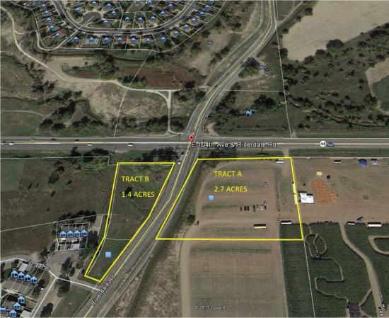 Both the SW & SE hard corners of 104th & Riverdale Rd, signalized intersection, tremendous exposure and access. Zoned Neighborhood Service (NS) in Thornton. Adjacent to public recreation and activity fields, and surrounded by residential developments. SW corner is 1.4 acres and SE corner is 2.7 acres. Can be purchased separately or together.