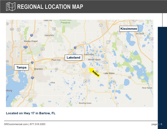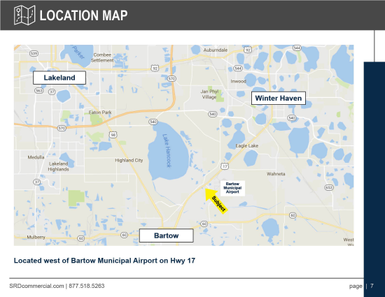 Located in Bartow, FL on Hwy 17, west of Bartow Municipal Airport. There are nearly 60 million people within a 60 mile radius; great site for distribution, manufacturing and light industrial. Proximity to Hwy 60 allows easy access to the Port of Tampa & east coast.