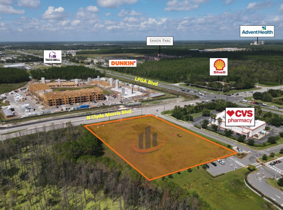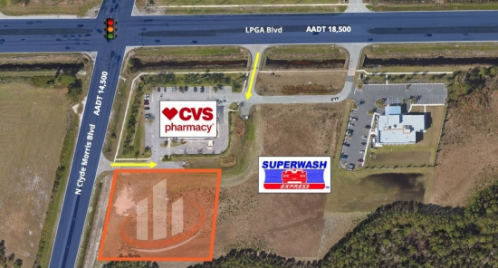 2.1 Acres directly South of the CVS at the SouthEast corner of LPGA and Clyde Morris. The property is in front of the new Superwash Car Wash that generates significant traffic throughout the day. There is direct access to both LPGA and Clyde Morris(316' Frontage). Off-Site water retention is already in place. The most likely uses will include medical offices, commercial retail and fast food. The list of prohibited uses is attached and includes surgery centers, day care centers, walk-in medical clinic, auto repair, liquor store, veterinarian and grocery.