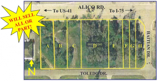 SW corner Alico Rd. / Haitian Dr., midway between US-41 & I-75 (Exit 128). Site is comprised of 8 parcels ranging from 4 parcels @ 9,064 SF each; 1 parcel @ 18,128 SF; 2 parcels @ 4,532 SF each; 1 parcel @ 6,214 SF, for a total of 69,665 SF or 1.6+/- acres. Will sell all or part. 385 Ft. frontage on Alico Rd. x 181 Ft. deep. 2006 daily traffic volume (AADT): 19,000. Offered at $1,200,000 for all 8 parcels!