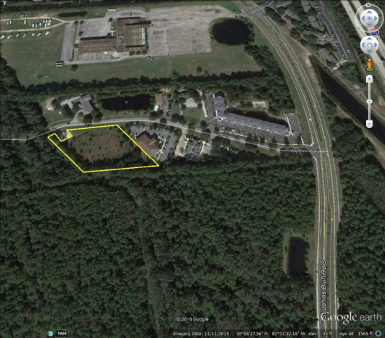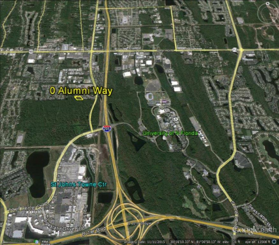 Subject is adjacent and west of 11246 Alumni Way. There are five offices and two residential buildings toward St. Johns Bluff Rd. Alumni Way is the only entry from St. Johns Bluff to a development of more than 200 homes. A church oriented 204 bed student residence facility was built across the street in 2015.
