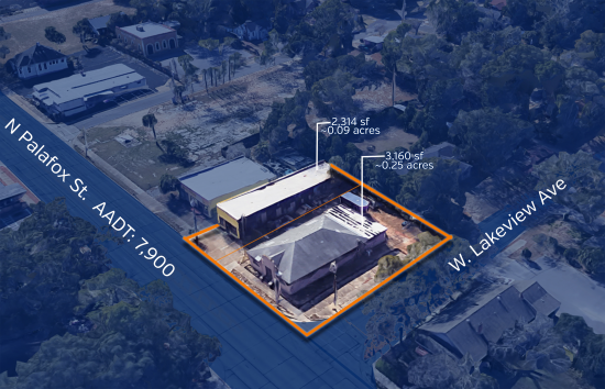 The properties highest and best use would likely be redevelopment into Office or Retail use. The asset has great visibility with 120 feet of frontage on Palafox St and 125 feet on Lakview Ave. The property has great ingress egress with the opportunity for street side parking along Lakeview. This space offers accomodations for: office building.
