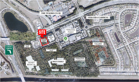 The Shoppes are a part of a +/- 1,000 acre PUD master planned community of +/- 3,200 home sites. Tesoro, a 1,400 acre community with 990 private homes, is located directly across from the Shoppes eastern entrance. Also close to the Veranda Falls Shoppes are many gated golf and country club communities, including Harbour Ridge, The Floridian, Evergreen Club, and Windstone. Over 1000's single family homes have either been recently built, under construction, or proposed. 300+ apartments and 200+ townhome units are underway directly behind The Shoppes of Veranda Falls. Tenet has recently announced plans for the 54 bed Florida Coast Medical and Surgical Center on 25 acres immediately behind this site. Completion is slated for late 2024. This space offers accomodations for: retail.