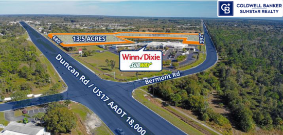 13.5 acre "Flag" property fronting on Highway 17 to the West and Bermont road to the South.