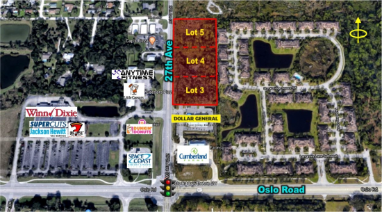 Prime site for retail or self-storage development. Located on 27th Avenue and Oslo Road, in area of dense residential communities in south Vero Beach, FL. Oslo Road is scheduled for a future I-95 interchange. Property is located opposite the Winn Dixie market center and proximate to the Publix market center at nearby Oslo Rd and 43rd Avenue. The property is configured as three 1.62 acre Lots totaling 4.86 acres with Site Plan flexibility to adjust Lot size - Lot lines not final yet. Each lot has approximately 230 feet of road frontage on 27th Avenue (Emerson) with 300 feet of depth. There is a common access easement to Oslo Road through the Dollar General and Cumberland Farm stores. Utilities and onsite storm water are available at site. Total 4.86 acre development site with Limited Commercial (CL) zoning. Join many other national retailers capitalizing on area growth. This space offers accomodations for: retailpad.