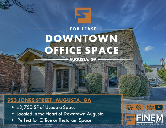 The Finem Group at Meybohm Commercial is pleased to exclusively present this fully remodeled downtown commercial space with exposed brick walls and curved wood ceilings with exposed beams. This building has a historic look but has been complemented by modern updates, including polished concrete floors that give it an aesthetically pleasing appeal for any type of business or organization looking to set up shop in downtown Augusta. This would be a great event space, restaurant, coffee shop, office, or creative space. The space is long and open but also has had a firewall added into the dividing wall and could be split in a variety of ways with 3,750 square feet. Some additional features are a kitchen, two full bathrooms, including a shower, an interior ramp from the Reynolds Street door, and a convenient parking lot. The property can be accessed from both Jones Street and Reynolds St. Don’t miss the chance to take advantage of the outdoor green and pond spaces right outside your door where your employees can enjoy the ducks in the spring or a lunch break in the courtyard. This space offers accomodations for: street retail.