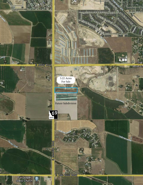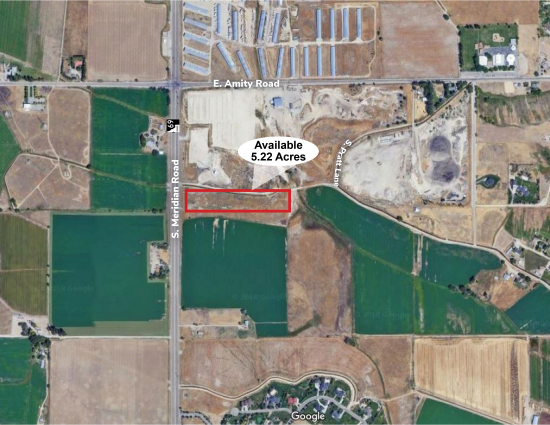 Lee & Associates is pleased to present this 5.22 acre parcel on S Meridian Road just south of W Amity Rd. for sale. The city of Meridian is the fastest growing city in Idaho and the 6th fastest in the US. The property is currently in unincorporated Ada County. However, it is surrounded on all sides by the City of Meridian and is likely to be annexed by the City of Meridian. Meridian has indicated it would place either an R-4 or R-8 zoning on the property which would allow for three (3) to eight (8) residential units per acre. The property is located 2.5 miles from 1-84 and 12 miles from Downtown Boise. This space offers accomodations for: other.