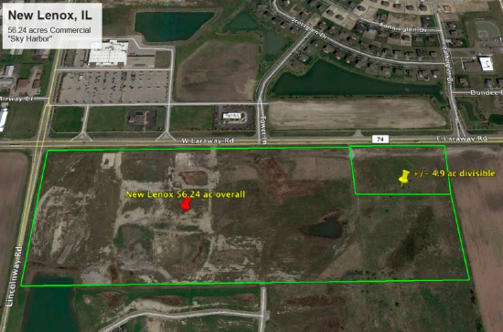 Sale Price by Request Only. This 56.24 acres is currently zoned C-4 on the Laraway Frontage and C7 regional shopping district in the rear and known as "Sky Harbor". the Village indicated they are flexible and open to a variety of commercial uses. Excellent access to route 30 and I-80 in a growing area. Seller will entertain partial offers.