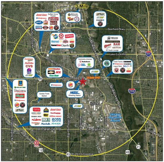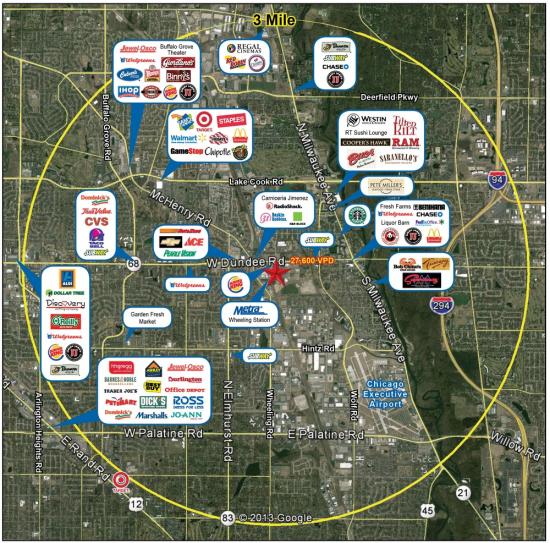 The development is located on heavily trafficked Dundee Road and the Wheeling Metra Station, just west of Milwaukee Ave. Dundee Road has a huge daily traffic count of nearly 40,000 vehicles per day. The property is also adjacent to the Village of Wheeling Park District, Acquatic Center, Heritage Park, and Village Hall.