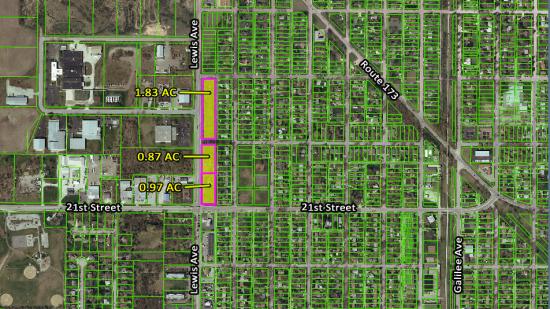 The property consists of three vacant lots located at the northeast corner of the intersection of Lewis Avenue & 21st Street in Zion, Illinois. The three lots are 0.97, 0.87, and 1.83 acres in size for a total of 3.67 acres that can be purchased together or separately.
