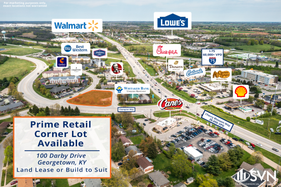 SVN Stone Commercial Real Estate is pleased to present this prime retail corner lot available for land lease or build to suit. 100 Darby Drive is .97 acres at the corner of Darby Dr. and Champion Way and has excellent visibility from Cherry Blossom (26,656 VPD). This property is one of the only remaining lots in the thriving Cherry Blossom retail corridor and has easy access to I-75. B-2 zoning allows for a multitude of uses.