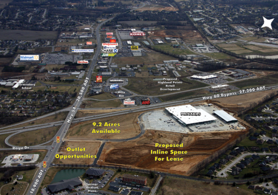 Inline space now under construction. Endcap space available. Retail development located at Highway 54 (Leitchfield Road) and US Hwy 60 Bypass; Anchored by Meijer and Menards. Inline space and outlots available; Area retailers include Wal-Mart Supercenter and Kohl's.