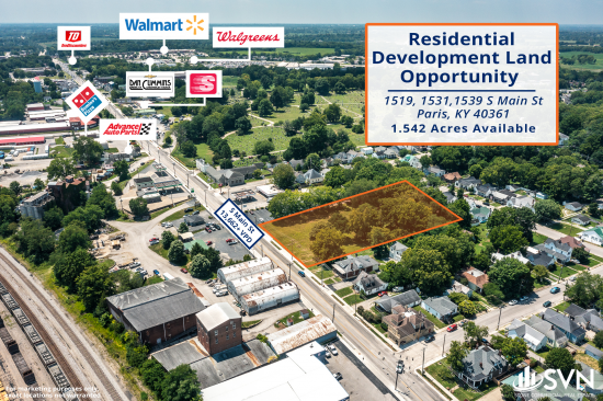 SVN Stone Commercial Real Estate is pleased to present 1.542 Acres of Development Land in Paris, KY. This land is currently zoned Residential and will be sold as a packaged deal. Immediate trade area tenants include Speedway, Hardee's, Walgreens, and more. With 13,500 + VPD fronting this site, the possibilities for a new owner are endless.