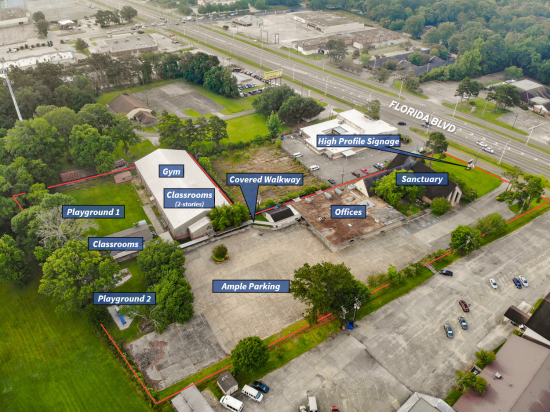 This turn-key church and school facility is located on Florida Blvd just west of Sherwood Forest Drive. The property features 41,833 square feet of improvements including a large gymnasium, administrative building, 20 classrooms, a full kitchen, and church/assembly space. The property is approximately 3.78 acres consisting of a sizable parking lot (approx. 123 spaces) setup for drop-off/pick-up, a playground area, greenspace, and 200 feet of frontage on Florida Blvd. The property is ready for immediate occupancy and would be an ideal facility for a charter school, a church with school operations, a corporate training facility, an events facility, or office space. This space offers accomodations for: school.
