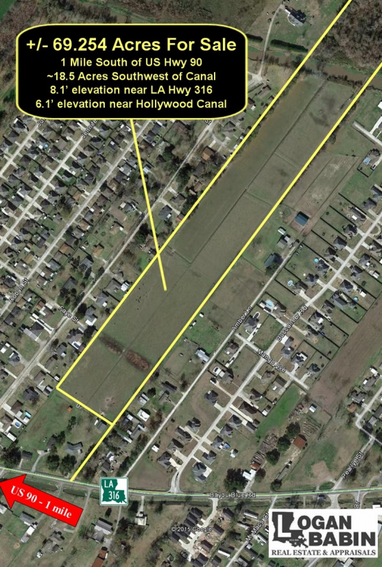 This listing is for 69.25 acres of property just 1 mile south of U.S. Highway 90 (Future I-49) on LA Highway 316 in the growing Houma-Thibodaux MSA. Located in the heart of America’s Energy Corridor, the acreage has a highest and best use for single-family residential development. Elevation at the front of the tract is 8.1' and at the Hollywood Canal is measured to be 6.1'.