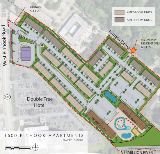 The Ridge apartment development will be a best-in-class product catering to University of Louisiana students based on a successful concept previously executed at major universities across the country. This new residential product allows for a retail component to be developed in conjunction with. The businesses operating out of the small-shop building will cater to the 194 apartment units (600 beds), as well as the existing business community that engulfs the site.