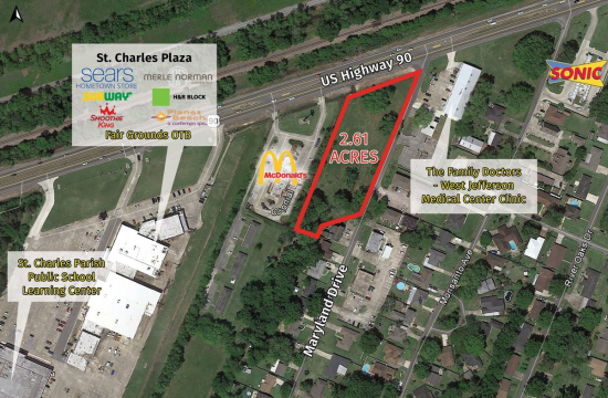 2.61 acres with 224’ frontage are now available on US Highway 90 in Luling, Louisiana. Located adjacent to McDonald’s and Maryland Drive, this property is ready for commercial development. Nearby is the Monsanto Plant (740 employees), Interstate 310, the Hale Boggs Bridge to the New Orleans Metro Area, Walmart Supercenter and several national and regional retailers and restaurants. There is a title restriction prohibiting funeral and cemetery and related purposes and will be imposed as a condition of sale. Contact Beth Cristina 504-650-3687.