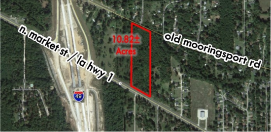 10.8± acres (subject to survey) prime development land with 435’ of road frontage on N. Market St. and 415’ of frontage on Old Mooringsport Rd.; property is at street grade, and served by Caddo Parish Sewer District #7 and Pine Hill Water Works District #8; zoned R-1D (Residential).