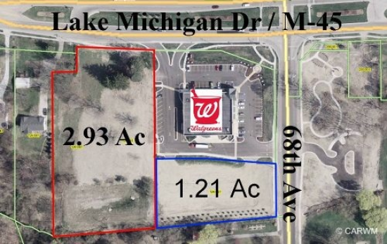 This lot & adjoining lot complete access to both M-45 & 68th Ave. Excellent site for dollar store, hardware, auto parts store, gas station-c-store or restaurant. Almost 4.2 total acres combined or purchase separately. With new by-pass completing soon, all new growth will be on this side of Allendale. Owner motivated.