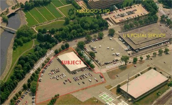Freestanding single story commercial building in downtown Battle Creek. Large 2.6 acre site across from Kellogg Company's world headquarters. 241 parking spaces. Butler Steel style building with metal siding and roof. Clear span interior, but currently has some interior partitioning in place. Designed for office space use with drop ceiling throughout. Many commercial uses possible. Sale or lease.