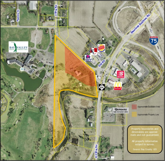 Rare opportunity to acquire prime COMMERCIAL development land at Exit 160 on I-75 at M-84 between Bay City and Saginaw. This property encompasses 12.5 acres bordering the Squaconning Creek and Bay Valley Resort Golf and Conference Center.