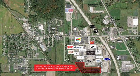 For sale – 17.8 ± acres adjacent to Birch Run Premium Outlets Currently zoned R-1A, but master planned General Commercial/C4 Highway Traveler 380 + feet of frontage along S Beyer Rd The last remaining parcel of this size in the Village of Birch Run Ideal for retail, hotel, or dealership Located off of busy I-75 exit for Frankenmuth (over 3 million visitors annually) Prime location near shopping, restaurants, and local attractions Reduced price: $799,000/$44,888 per acre