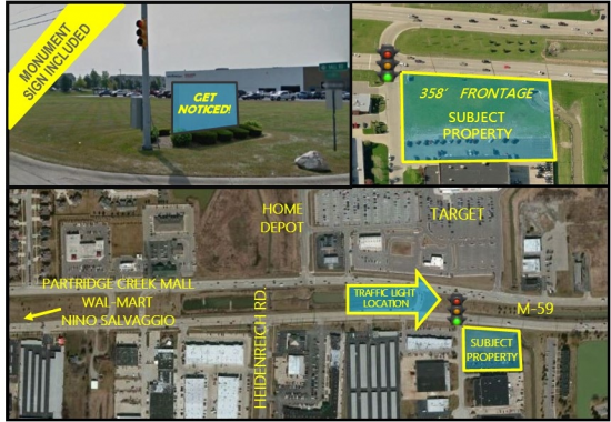 358 feet of M-59 frontage on the Golden Corridor of Macomb County. Located at a hard corner with traffic light. Adjacent to Home Depot and Target. Offers easy access from east and westbound Hall Rd.