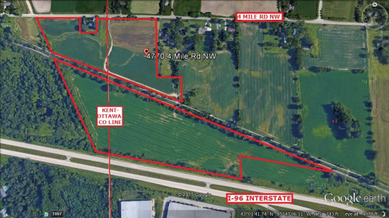 Prime 41.5 Acres of Agricultural land with 26.9 Acres in Walker City with an adjacent 14.6 Acres in Tallmadge Township. Owner will sell each of the 2 parcels separately which are also listed separately. Excellent frontage and exposure with 1200' frontage on 4 Mile & Hayes St and over 2500' frontage on I-96. Coopersville & Marne Railroad divides property N & S but provides a legal access for crossing. Also the Musketawa White Pine Trail Connector is parallel to and within the Coopersville Marne RR Property. One large rented billboard sign on property facing E for W Bound traffic. Billboard lease to expire this year and subject to renewal with new owner. This Agricultural land is leased out on a year to year basis and is leased for 2015. Rare find of Ag land close in with a tremendous amount of road and Interstate frontage. Buyer would have the option for several splits between 5 or 6 parcels. Outstanding location with easy access to I-96 about 1 mile away at 8th Ave.
