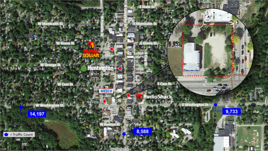On the corner of Washington St & Lafayette St in downtown Greenville. Subject includes 2 Parcels "A" & "B". Parcel "B" includes a comm. 66' x 96' building in good condition with a 16' overhead door in the rear and glass office frontage on Washington St. Possibility of selling parcels separately.