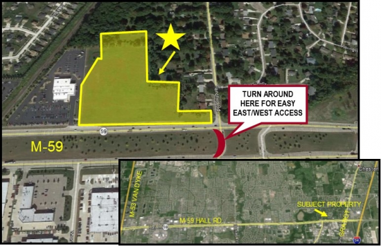 963 feet of high profile frontage on one of the few remaining large parcels on M-59's "golden corridor". MDOT traffic count of 70,000 cars daily. Two minutes from I-94 and ten minutes from I-696.