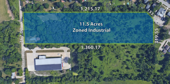 11.5 acres zoned industrial, 367 x 1,215 - city water and sewer! 30' x 40' garage, trees and scrub brush throughout. Located just south of 27 Mile adjacent to the city of New Haven. Neighbors include Capital Sturdy Grinding and Basic Metals. Priced to sell! To be split from neighboring parcel #06-33-103-035. Alta survey is available for serious buyers. This space offers accomodations for: office.