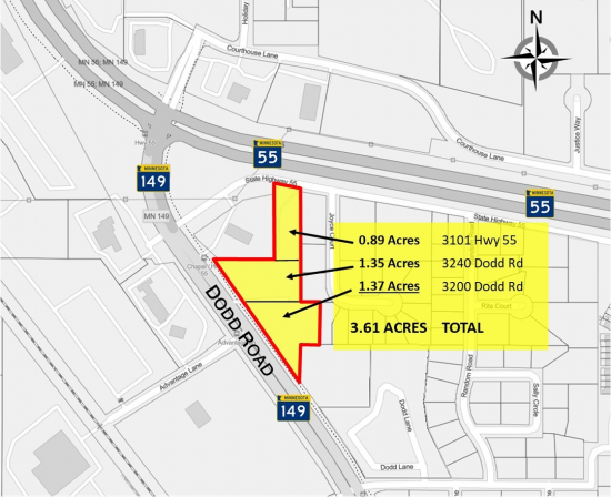 3.61 acres for sale along Dodd Road (Hwy 149) and just south of Hwy 55. The existing zoning permits most medical, retail, restaurant, and office uses. Many national and regional companies within 3-mile radius of the site: Thomson Reuters, Ecolab, UPS Customer Center, Cintas, TCO Performance Center (MN Vikings practice facility), and Dart Transit are just a few. Part of the 2040 Comprehensive Plan for Eagan (per their website) recognizes the need for redeveloping and is open to other zoning options here.
