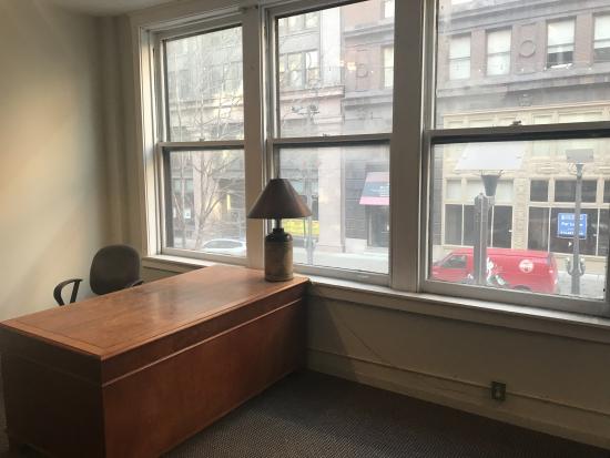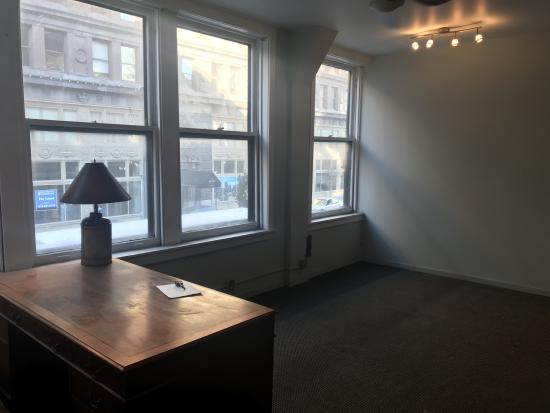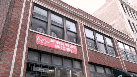 Professional office suite with a bird’s eye view of Washington Avenue. The suite has two private offices with some storage and reception area. The front office is approximately 285 SF with a 21-foot window-line. Interior finish includes 8-foot suspended ceiling with fluorescent and track lighting, carpeted floor, and ceiling fan. This office is ideal for any business professional with a great location on Washington Ave. All office suites have access to public restrooms located in the rear of the building. Rent includes all utilities, maintenance and janitorial of common areas. This space offers accomodations for: downtown office, office lease, professional office, st louis office lease, washington ave office.