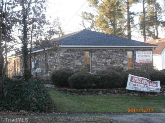 1225 SF office building near busy intersection. Paved driveway and parking, stone exterior. Also includes 1400 SF house next door (also zoned B-2). Located just north of the intersection of South Cox Street and East Kivett Street