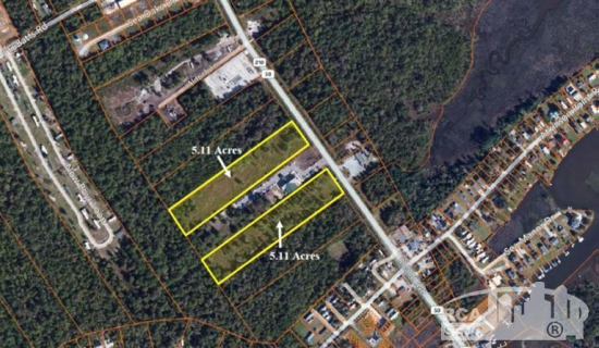 Two +/-5.11 AC tracts of land available for individual or joint purchase (+/-10.22 AC for $700,000 - MLS 613060). Property fronts to highly trafficked Highway 50, just before the bridge to Surf City. Zoned C-3, the property is suitable for a wide range of commercial uses.