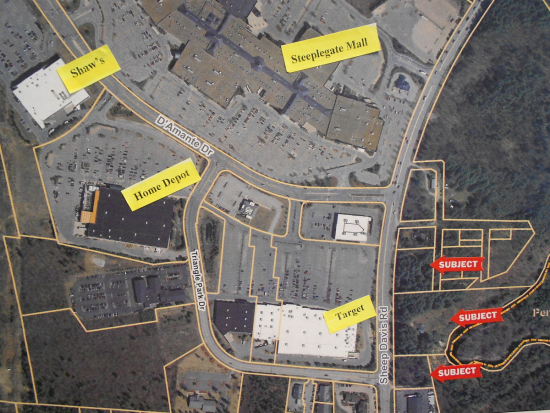 Nice development opportunity. Flat lot with 200' frontage at a busy intersection across from the Steeplegate Mall. Sewer at the frontage, water is across street. Zoned retail/office. There is a small house currently on-site.