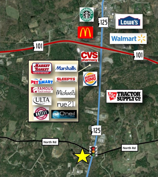 Commercial land opportunity at lighted intersection on heavily traveled route 125. Land consists of 2.50 +/- acres. Located approximately 1 mile from route 101 with 600’+ of frontage on route 125. Zoned retail/showroom/industrial for a multitude of potential uses.