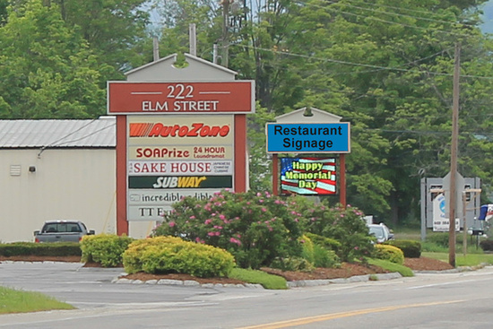 The 2,905 sq. ft. end-cap space is highly visible with its own pylon sign along busy Elm Street (101A). End unit restaurant space (2,905 SF) available now and can be renovated to fit alternative uses. Outdoor seating area and take-out window. The 1,004 sq. ft. middle unit is next door to Subway, AutoZone and the largest laundromat in town. High traffic area. Excellent signage and parking. Signage is available on the plaza's lit sign. Tenants also have the ability to advertise on the plaza's digital sign a discounted rates. CAM $4.35/Sq. Ft.The facade under went a face lift and the owner has plans to continue to improve the appearance of this center.