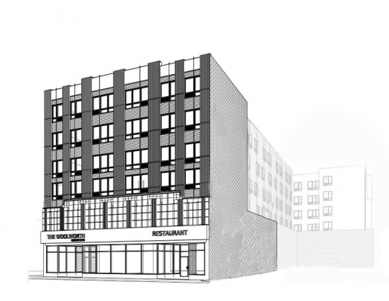 Open retail space on Main Street in downtown Hackensack at the ground level of a new 72 unit luxury apartment building.